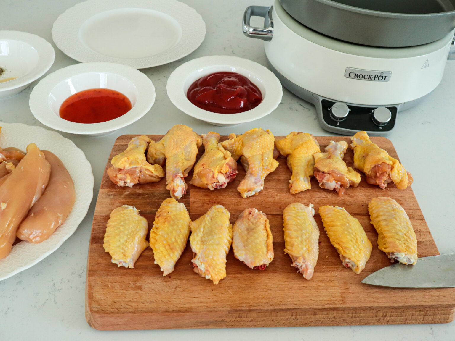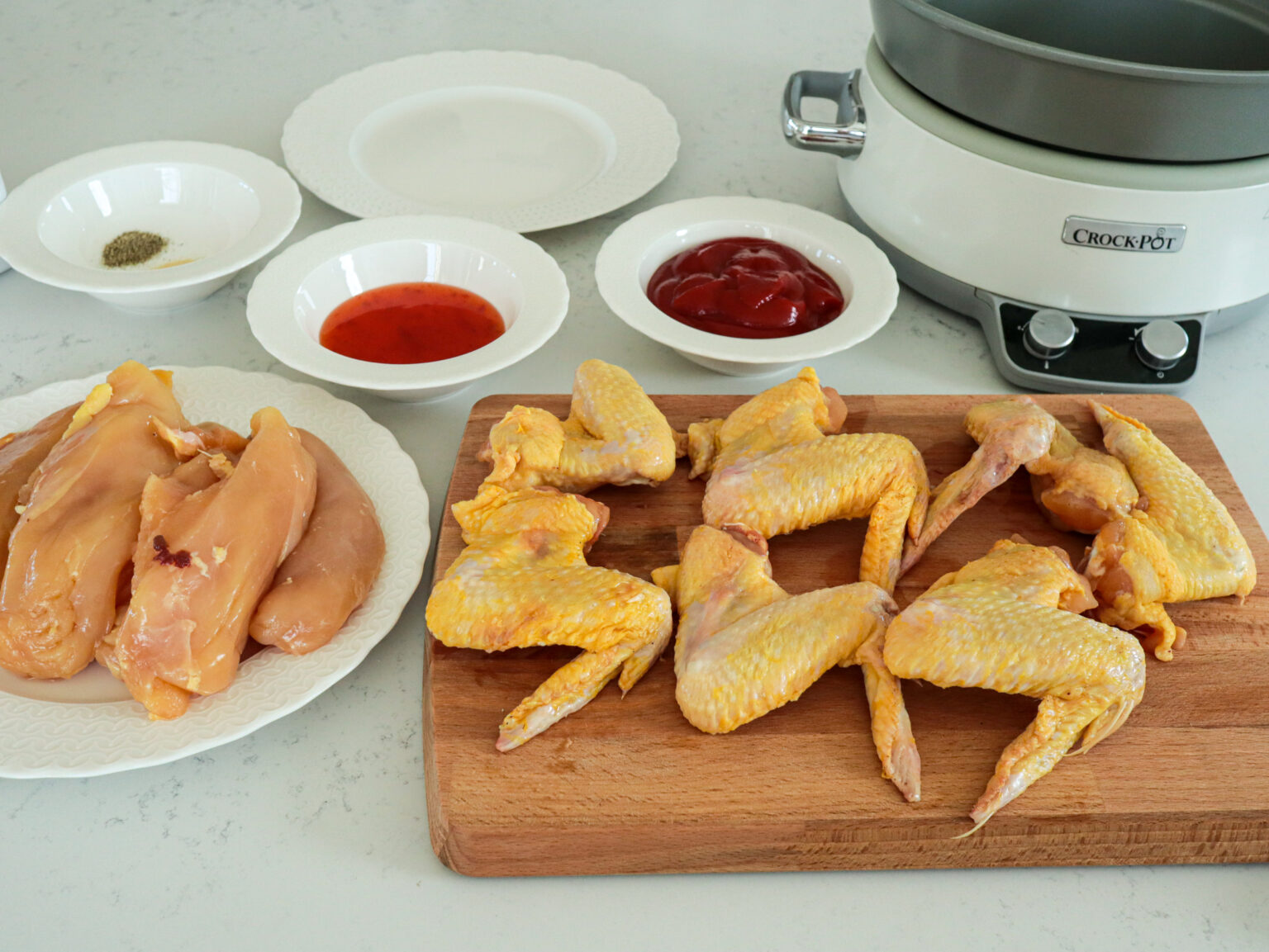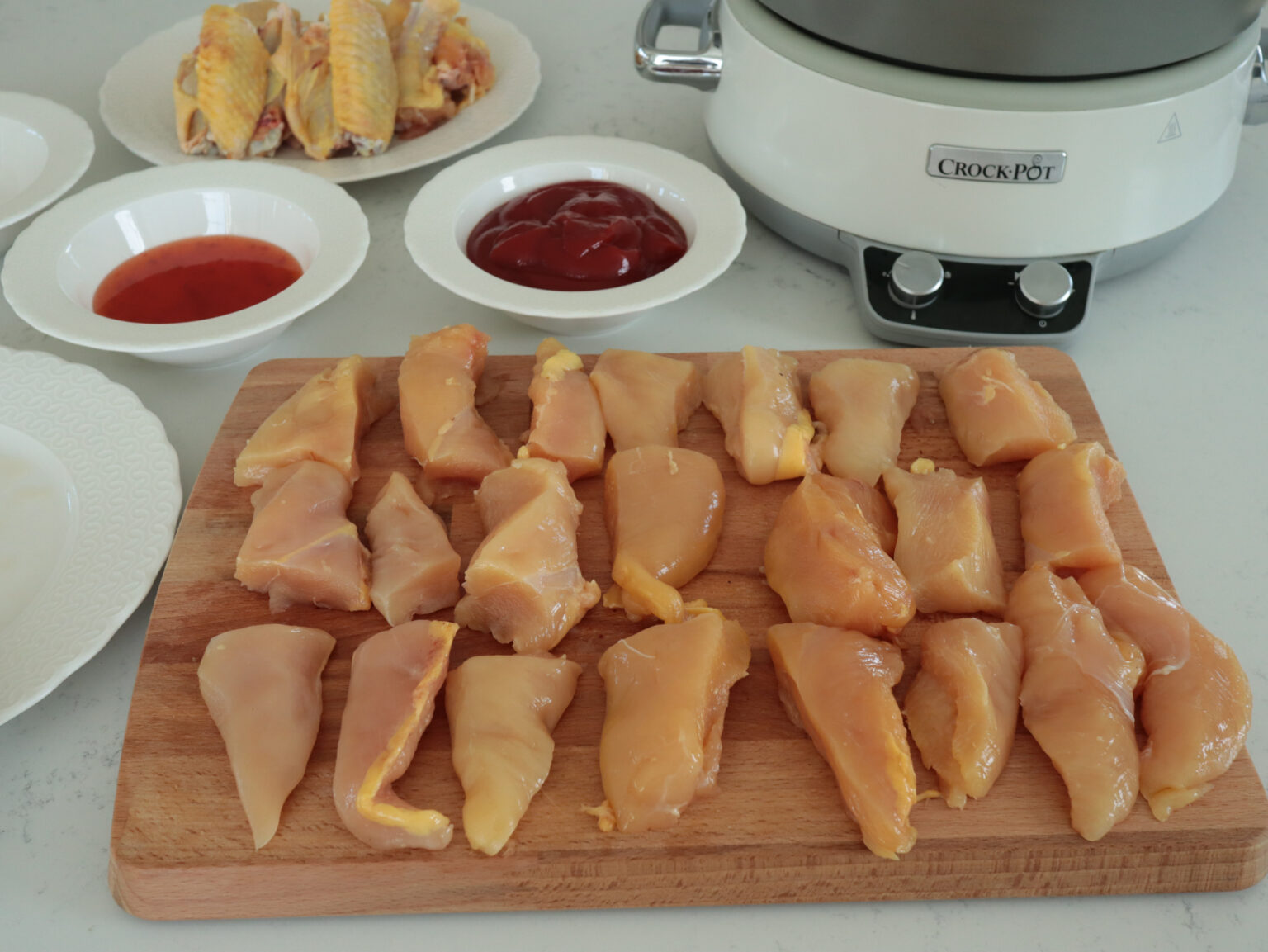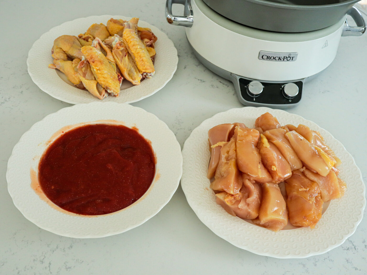 Reteta este una extrem de simpla si cu puține ingrediente. Tot ce trebuie sa facem este da curatam si taiem aripioarele si pieptul de pui. Sa facem un sos din ketchup, sos dulce acrișor, usturoi granulat, sare si piper pe care sa il amestecam bine un vas cu carnea. Punem totul la slow cooker, le scoatem si le mai bagam la cuptor puțin pentru a deveni lipicioase si gata!