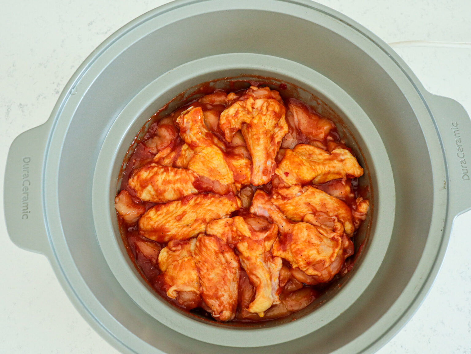 De mult am in plan sa fac aripioare la slow cooker. Orice carne preparata in vasele Crock-Pot iese foarte frageda si bine gatita. Iar pentru ca se gătește perioada indelungata la temperatura joasa, se pastreaza si nutrientii. Ca sa înțelegeți cum funcționează un slow cooker: timpul setat pe timer este timpul in care temperatura ajunge la 100 de grade. Acest timp poate varia între 1 si 24 h. Crock-Potul in care am fac eu acest preparat este Dura Ceramic cu vas de 6 l .