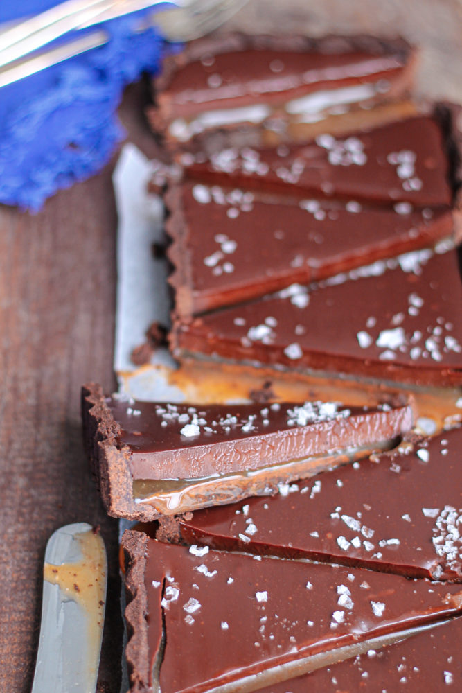 Tarta cu sos de caramel, crema de ciocolata neagra si fulgi de sare