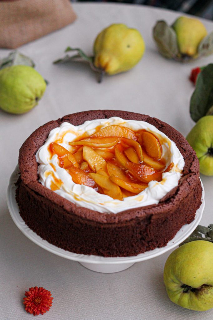 Prajitura cu ciocolata, fara faina, cu crema fina de branza si gutui caramelizate si flambate