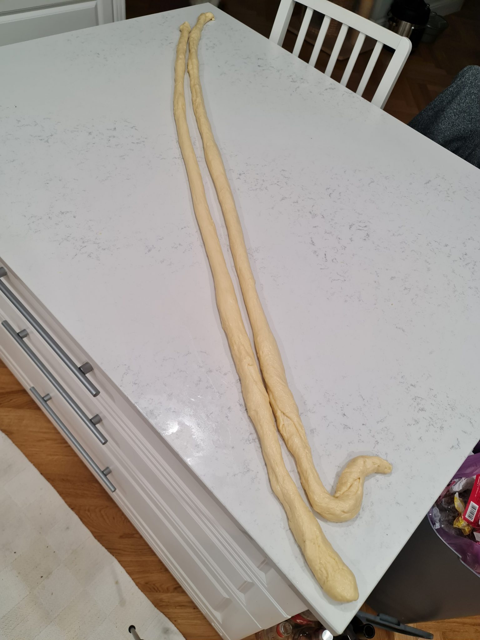 Dupa cele 2 ore scoatem aluatul din bol si il impartim in 2