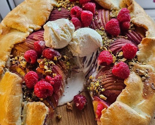 Retete dulci Galette cu cremă de griș, piersici, zmeură și fistic, servită cu înghețată CITEȘTE ARTICOLUL