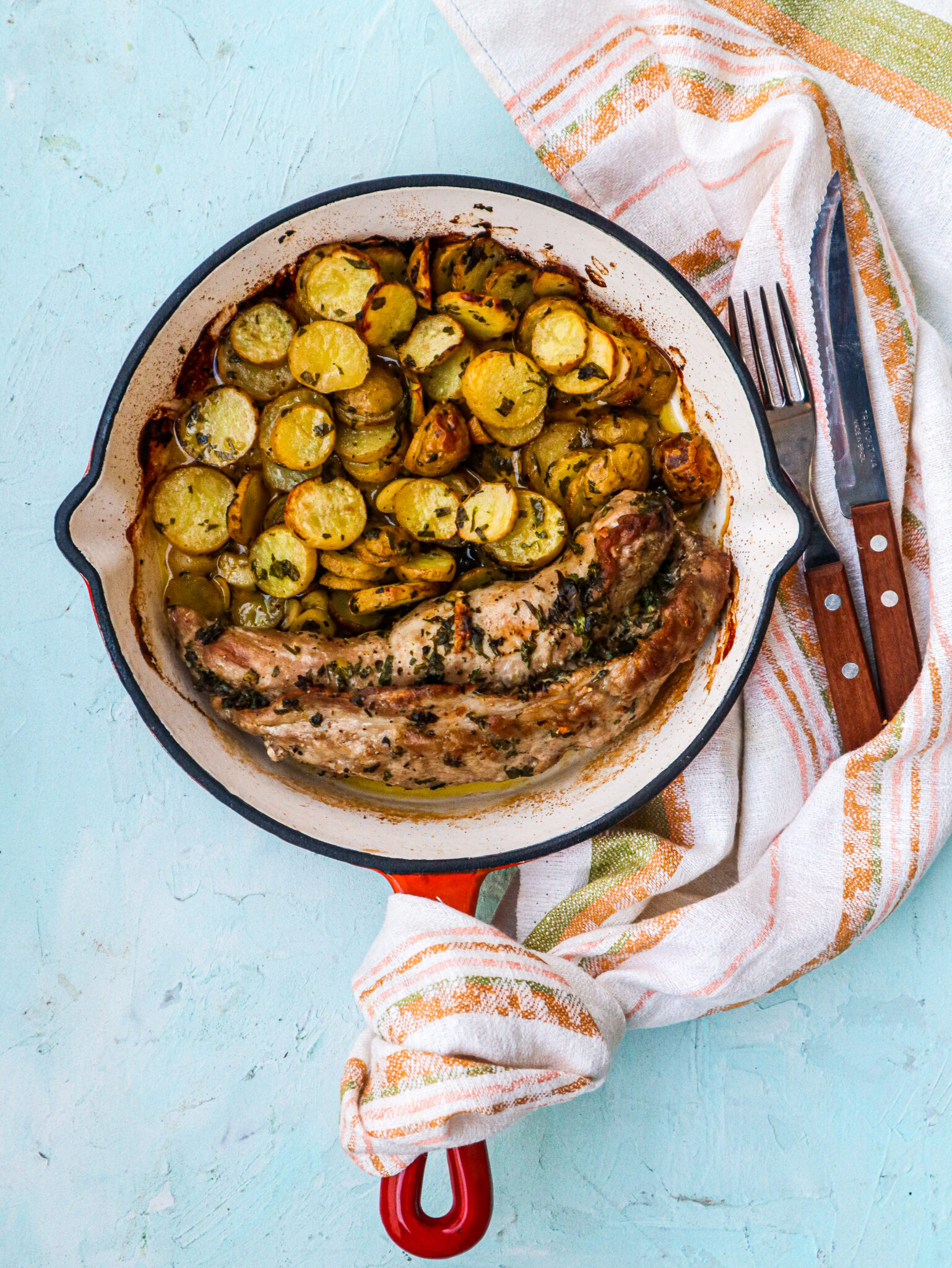 Muschiulet de porc cu ierburi aromatice si cartofi noi, la cuptor