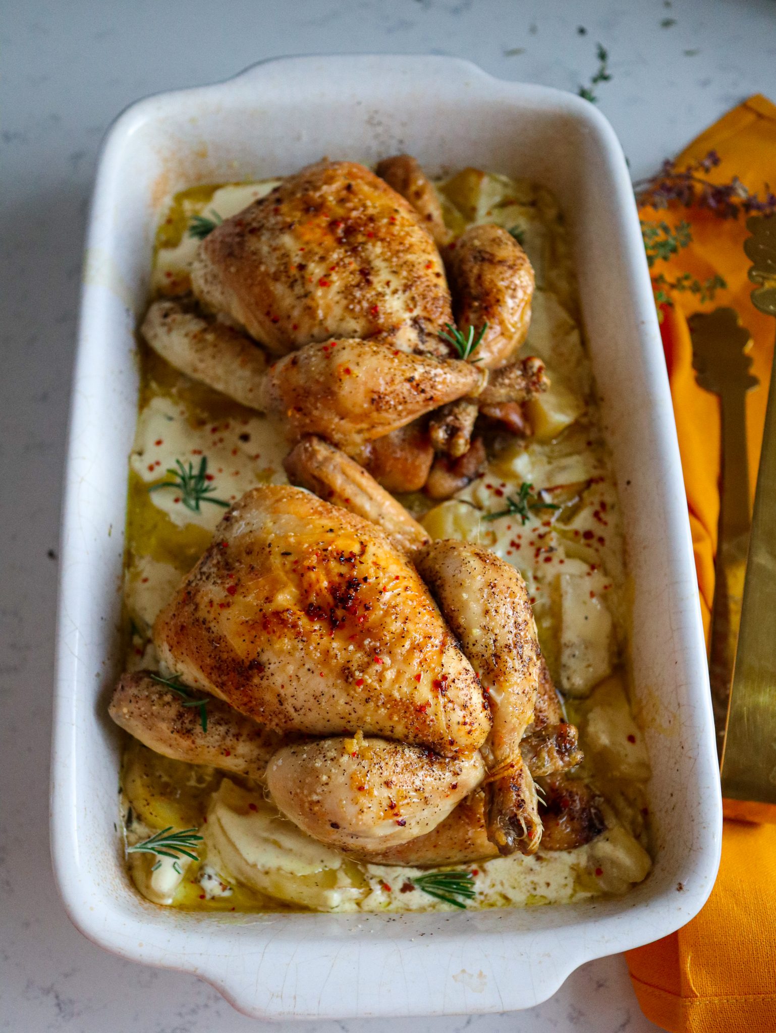 Adaugam puii inapoi peste cartofi și introducem din nou la cuptor pentru 20 de minute.