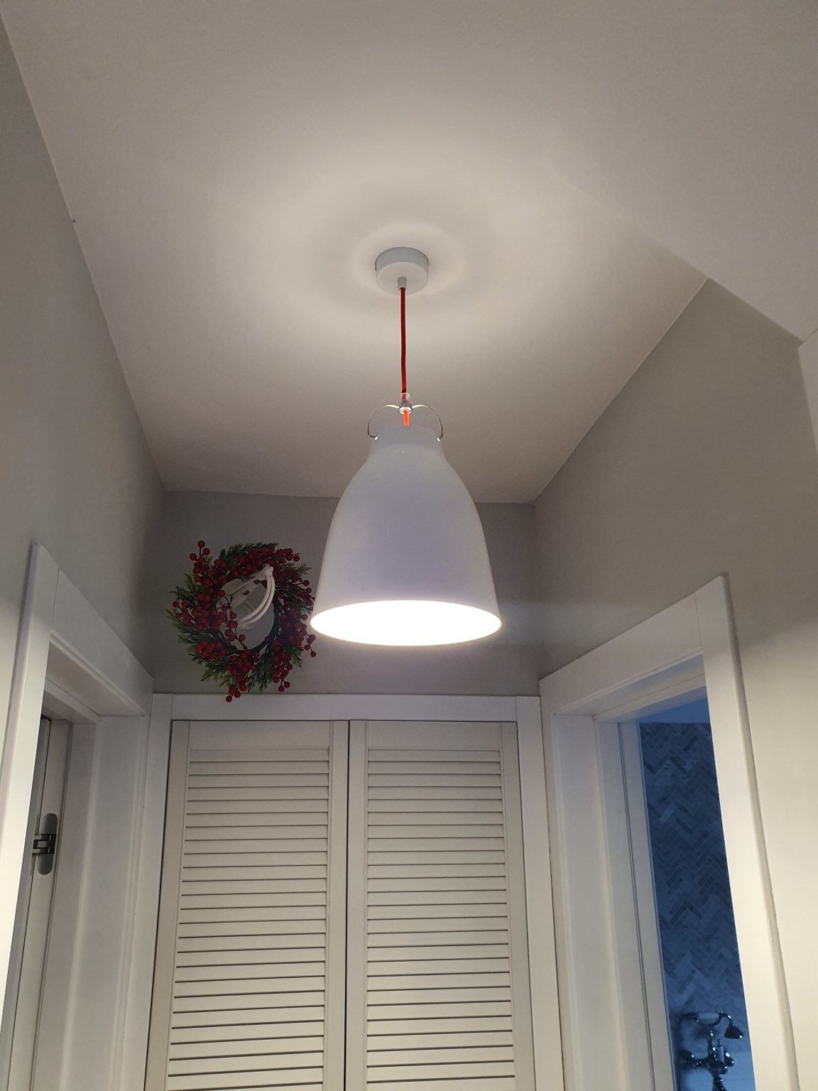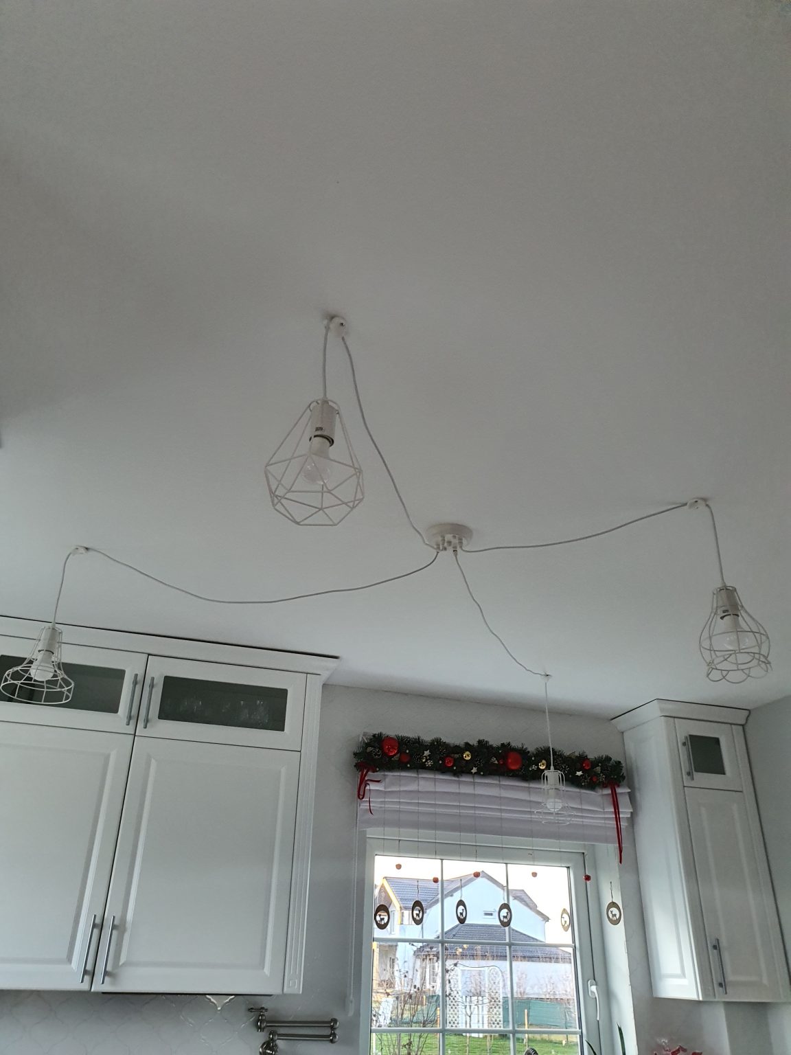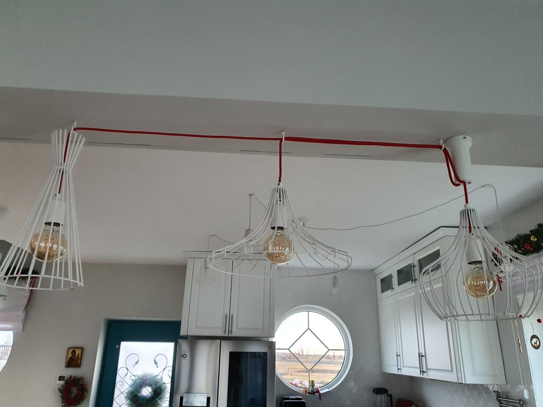 Pentru zona de intrare, am dorit ca primul corp de iluminat care se vede cand intri in casa sa fie unul statement. Asa a si fost. Am gasit un clopot stil farmhouse, cu usoare accente industriale si am folosit un bec mare, decorativ, cu lumina calda. Spre deosebire de desingnul interior al casei pentru care am colaborat cu un arhitect, schema pozitiilor corpurilor de iluminat am facut-o singuri, iar in zona bucatariei am fost usor neinspirati. In bucataria, zona propriu zisa, cu mobila si zonele de lucru, am avut o singura iesire pentru corp de iluminat. Drept urmare aici am fost norocosi sa gasim un sistem de corpuri stil paianjen pe care am putut sa il extindem in toate zonele de lucru: insula, chiuveta, zona cu electrocasnicele. Desi dupa montaj nu am fost convinsa ca imi place, acum imi place foart mult si esste cea mai potrivita si utila alegere. La corpul paianjen am pus becuri puternice cu lumina rece. Deasupra peninsulei, care face departajarea intre bucatarie si living si pe holul care duce spre baie, dressing si dormitorul de oaspeti, am montat corpuri albe cu fire rosii. Am fost mai mult decat incantata de ele, deoarece inrameaza perfect bucataria. Va si spun cum: in partea opusa corpurilor cu fire rosii se afla electrocasniele mici, rosii pe mobila alba. Acum ati inteles incantarea mea, nu? 🙂 Pentru cele 3 piese de desupra peninsulei am pus becuri cu lumina calda, iar pentru ce de pe hol, lumina neutra.
