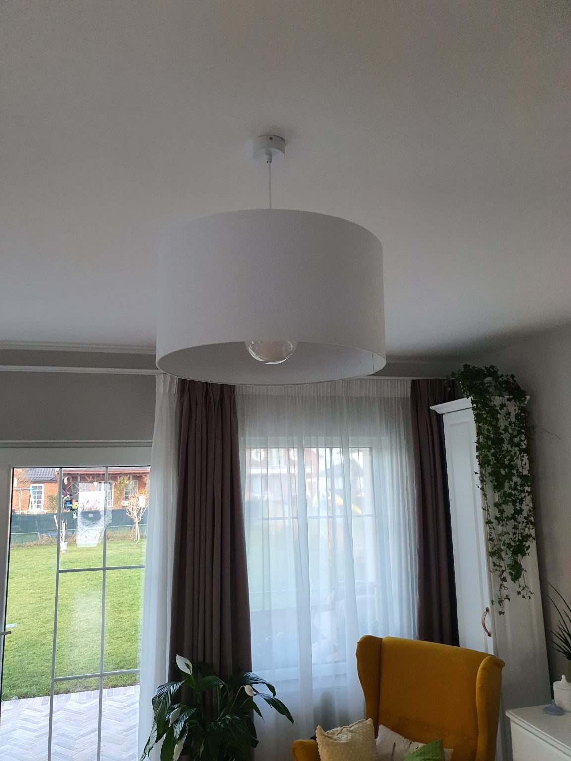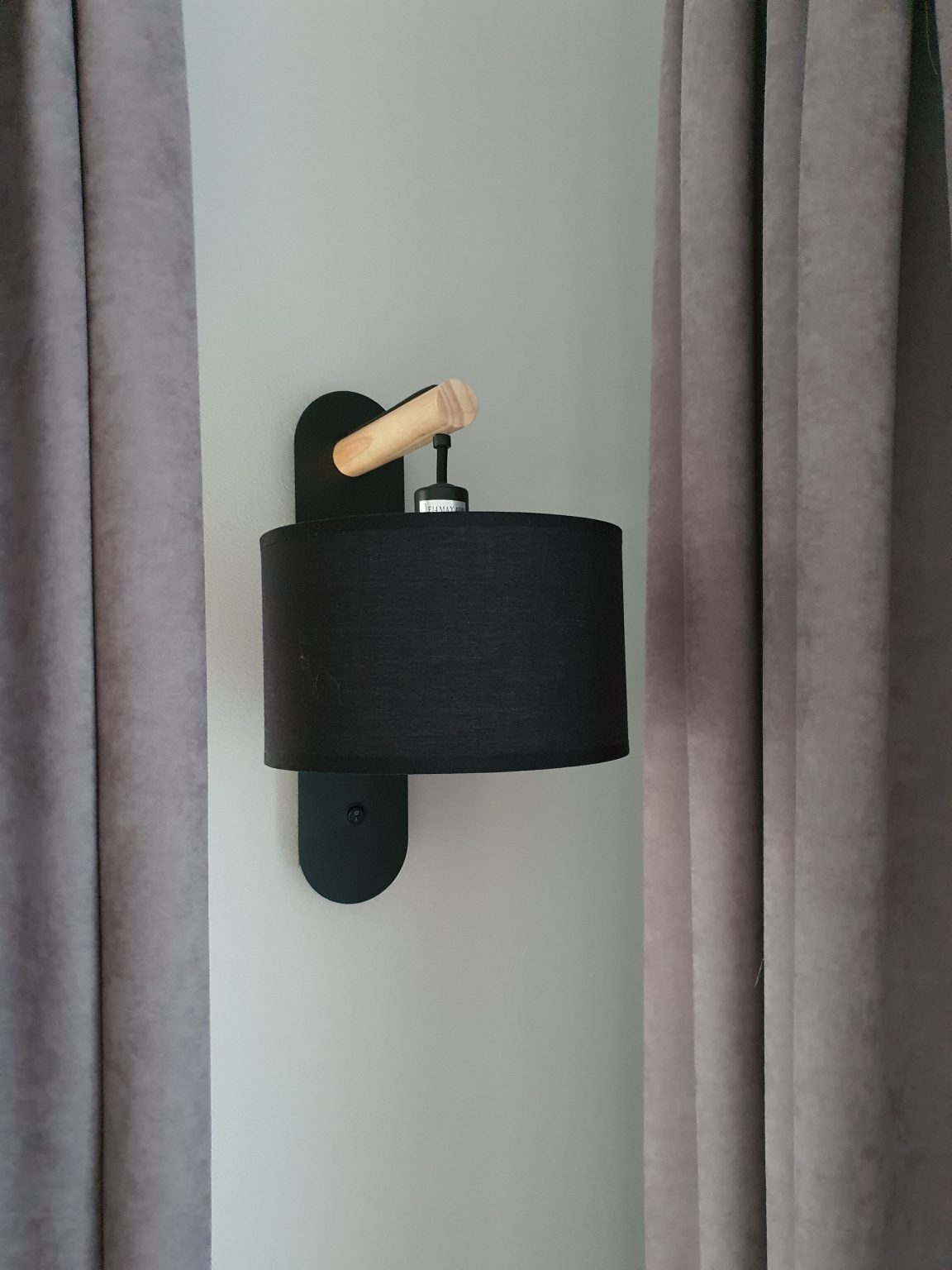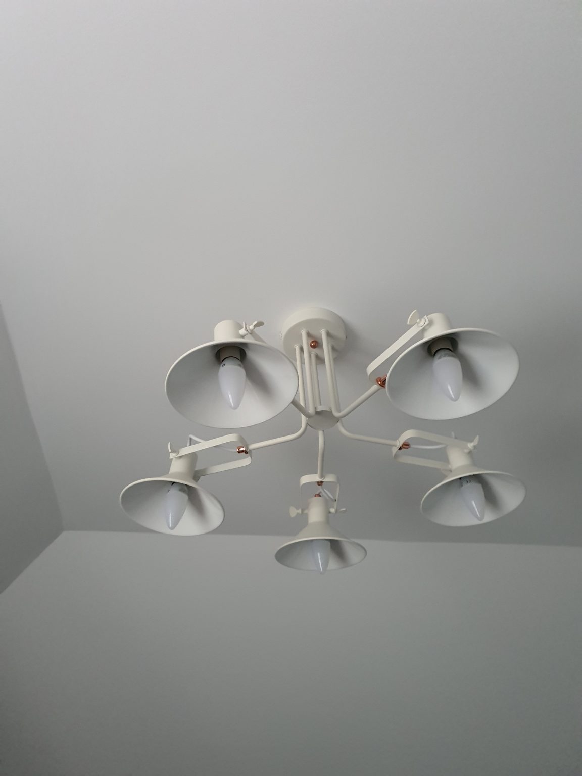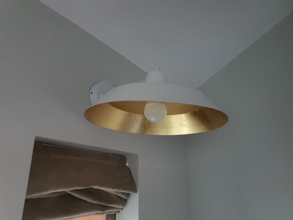 In camera care are fereastra spre fata casei, spre drum, pe care o numim in amintirea bunicilor nostri „odaia de la drum”, am optat pentru o lustra cu 5 abajururi in forma de palnie, cu detalii usor industriale albe si in culoarea cuprului. Tot in aceasta incapere avem si o lampa simpla, cu picioare din lemn si abajur gri, dar si o veioza mica, pentru acrea atmosfera calda cand stam cu luminile stinse. Pe holul care face intrarea in aceasta camera, dar si in baia tehnica si dormitorul matrimonial, avem un corp alb, simplu, cu lumina neutra, cu abajur in aceeasi forma de palnie, ca cel din camera.