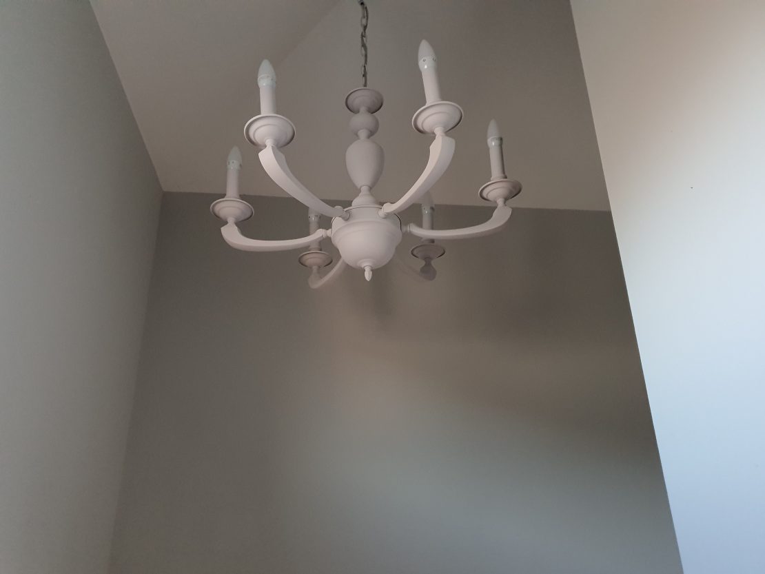 Pentru ca am pastrat o inaltime destul de mare in aceasta zona, am vrut sa o evidentiem, drept pentru care am montat un candelabru metalic cu 5 brate, cu becuri tip lumanare, la vedere. Pe peretii casei scarii am pus aplice ca cele de la baia de la parter. Toate corpurile de iluminat au lumina neutra.
