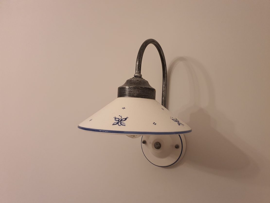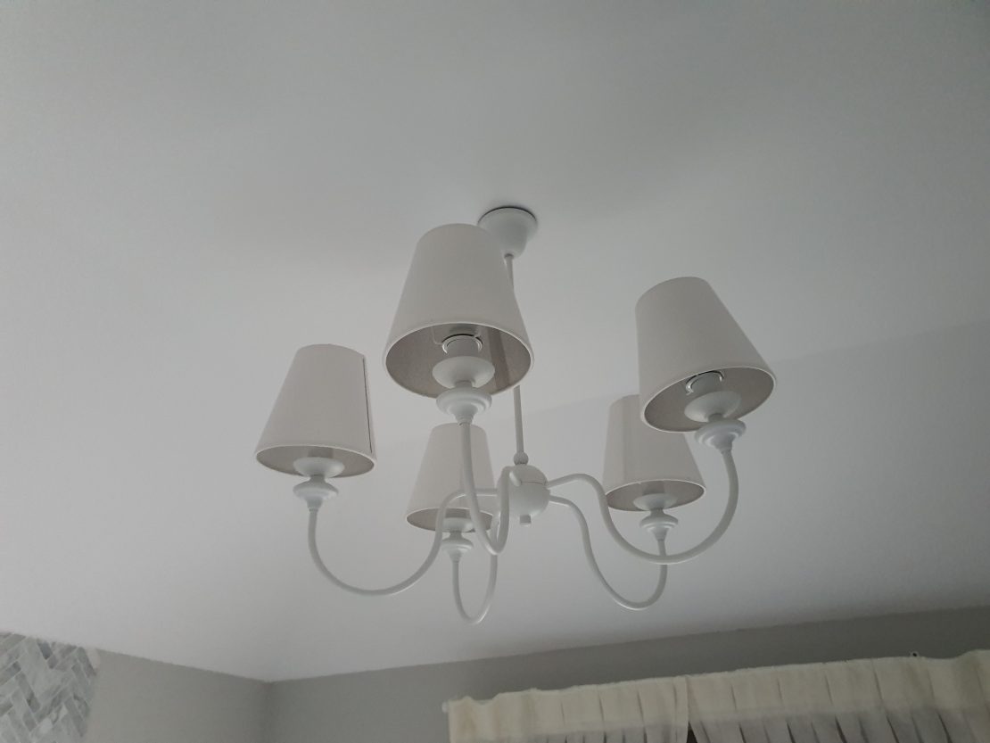 Desi este camera in care stam cel mai putin, aici am ales cele mai elegante si preioase corpuri de iluminat, toate trei lucrate manual. Avem o lustra cu 5 brate cu detalii din portelan alb cu decor albastru regal, cu becuri la vedere. Desupra noptierelor aplicele sunt cu abajururi din acelasi portelan alb cu detalii albastru regal, diferite insa ca model. Ca becuri pentru lustra am ales lumina neutra si pentru aplice lumina calda.