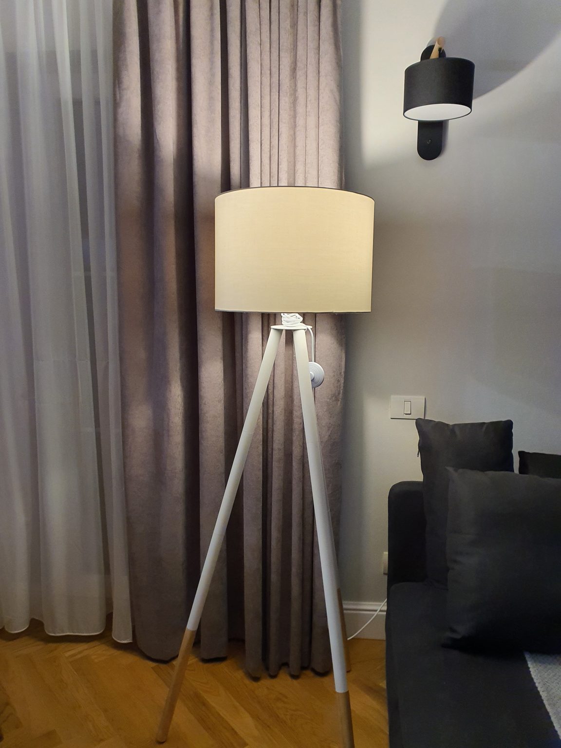 Am optat pentru corpuri simple, albe, pentru ca atentia sa rămână pe zona de jos: canapea, zona cu comode, proiector si fotoliu. In zona de tranzit avem un corp simplu, alb, cu diametrul de 40 cm, bec mare cu lumina neutra. In zona canapelei o lustra cu trei abajururi tubulare, mai mici, cu becuri cu lumina neutra. Pe peretele din spatele canapelei 2 aplice de 20 de cm, negre care sa creeze o amtosfera calda cand restul luminilor sunt inchise. Becurile, dupa cum bine v-ati dat seama, au lumina calda. Tot in living avem si o lampa cu abajur tubular cu diametrul de 40 cm, cu trei picioare – in partea de sus albe, metalice, iar in partea de jos din lemn de stejar, facand astfel trecerea din partea superioara in jos, pe parchet. Becul este tot unul cu lumina neutra.