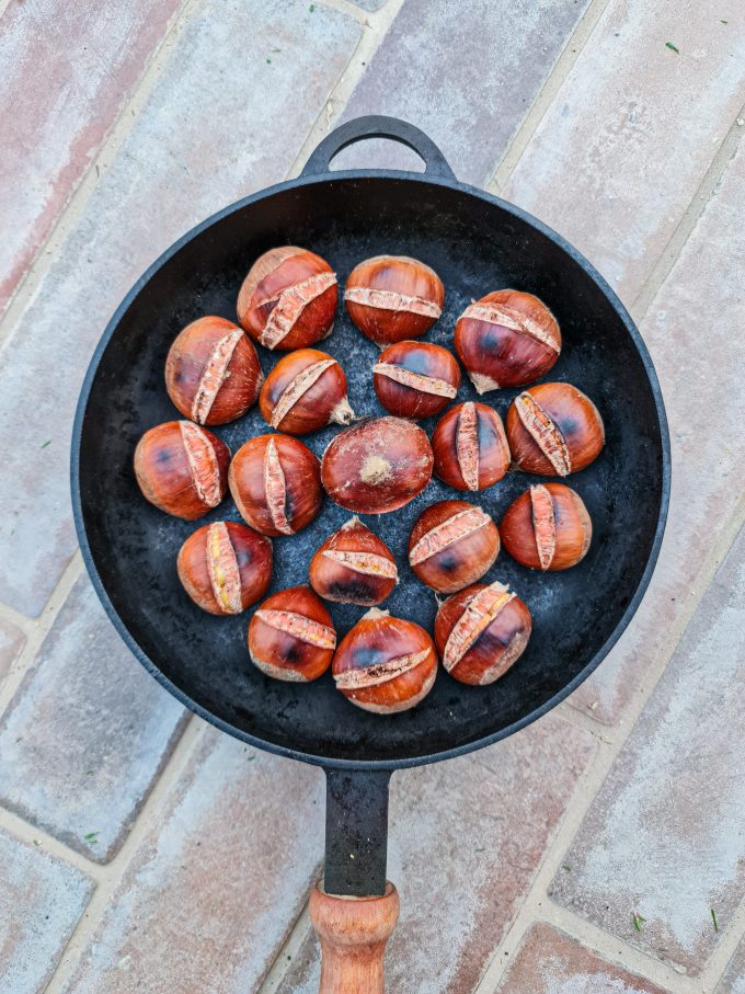 Daca gasesc castane bune, treaba e super simpla: le crestez drept, adanc, pe o parte, apoi le pun intr-o tigaie de fonta si le las la foc mediu 10-15 minute. Dupa 15 minute pun un capac si le mai las cateva minute.