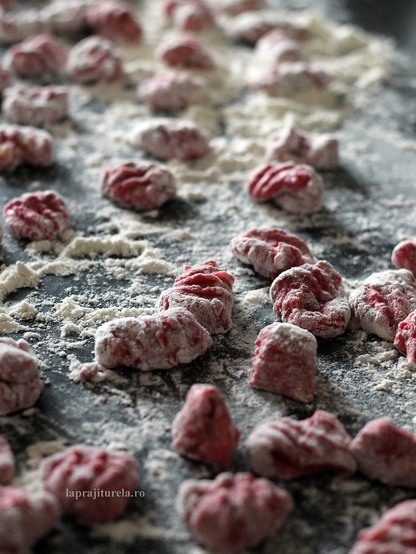 Ce sunt de fapt gnocchi: sunt un fel de paste cu cartofi specific italiene, care isi au originea in Imperiul Roman. Avand la baza faina din grau dur (semolina) si branza, acestia au suferit diferite variatii de-a lungul timpului, ajungand astazi sa fie facuti din faina din grau dur (sau faina alba), cartofi, ou si parmezan. Eu am hotarat sa le dau o nota personala si sa ii scot din anonimat cu sfecla rosie si bineinteles mult-iubita-leurda.