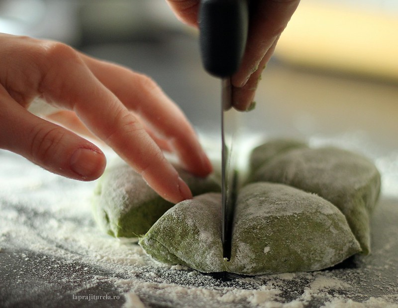 scoatem aluatul de la frigider, apoi il taiem in 12 parti egale
