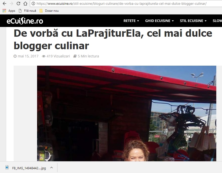 Acum ceva timp am avut placerea sa raspund unui interviu foarte simpatic pentru revista online eCuisine.ro. Daca vreti sa aflati cum a fost la Bake Off Romania sau ce planuri de viitor am, va las interviul aici: De vorba cu LaPrajiturEla, cel mai dulce blogger culinar