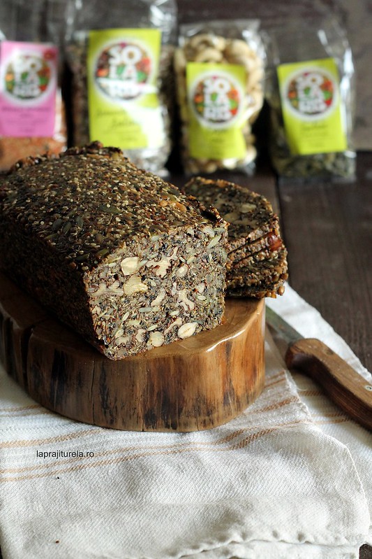 Reteta originala am gasit-o pe youtube pe pagina unui suedez (cred). Din pacate am cautat pagina acelui domn, care avea multe alte retete faine, insa nu am reusit sa o gasesc. Dar l-a gasit Catalina de la Kiss the Cook: canalul se numeste Kvali Food – multumim, Cata. La noptile de nesomn, stres si cele 47 de kilograme la care ajunsesem cand ma documentam pentru conscurs, nu ma mir ca nu mai tin minte numele canalului de youtube. Mandra sunt insa ca am reusit sa o fac astfel incat sa obtin o „caramida” plina de aroma si gust, densa, dar si foarte grasa. Spre deosebire de o paine normala, painea pe care v-o prezint azi este facuta exclusiv din seminte de nuci, legata cu ueli si oua (multe). Asadar ea iese din tiparele unei paini uzuale. Spuneam ca este o paine grasa pentru ca, fiind facuta doar din seminte si nuci este foarte bogata atat din punct de vedere al grasimilor, cat si al caloriilor (din fericire nu din acelea multe si goale).