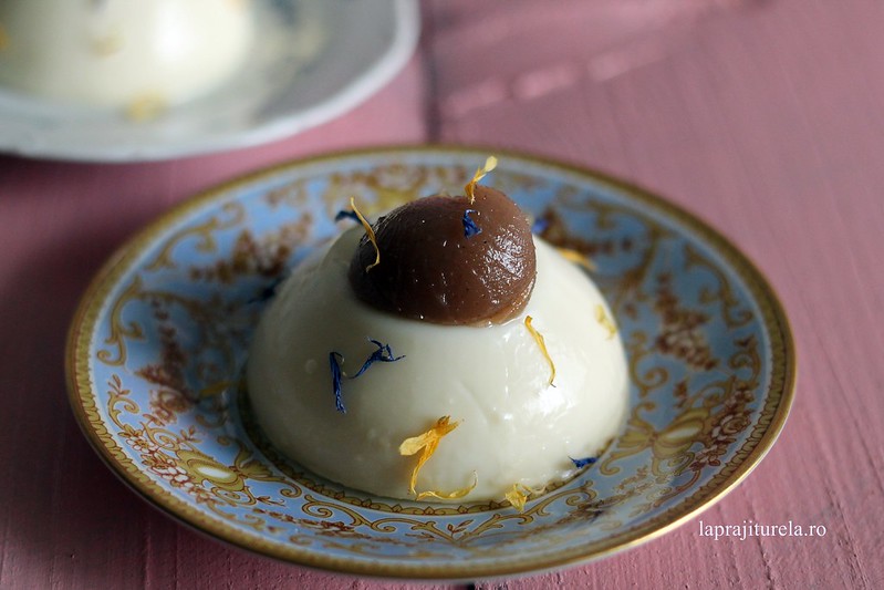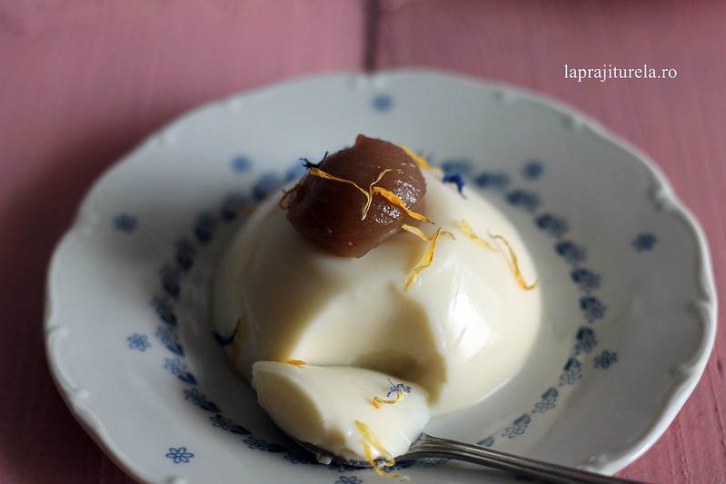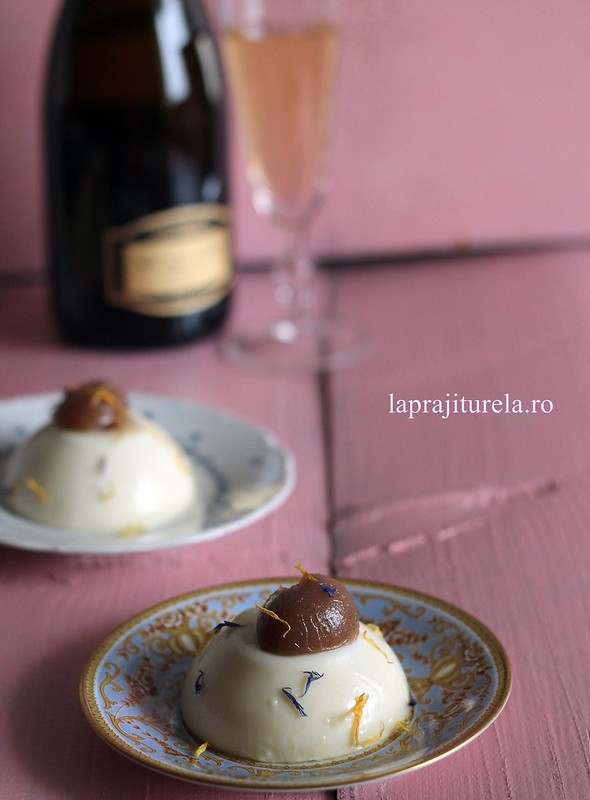 Ca reteta m-am gandit sa va propun o reteta italiana pe care, bineinteles am adaptat-o usor (doar ma stiti). Pentru a indulci panna cotta facuta cu lapte integral, am optat sa folosesc miere din castane si cicolata alba. Mierea a fost o adevarata surpriza, are un gust foarte intens si usor amarui, foarte diferita de ce am gustat la noi. Ca decor si in completare am pus o cupa mica de dulceata de castane, iar langa, bineinteles, dragostea noastra, un vin spumant dulce, numai bun langa un desert.