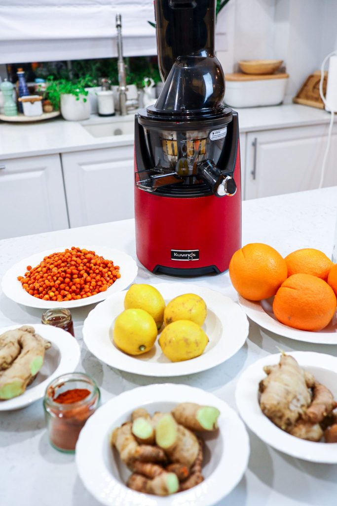 La fiecare portocala, lamaie sau 100 g de catina am adaugat: 25 g ghimbir proaspat, 10 g turmeric proaspat, un varf de lingurita piper proaspat rasnit, un varf de lingurita de piper cayenne.